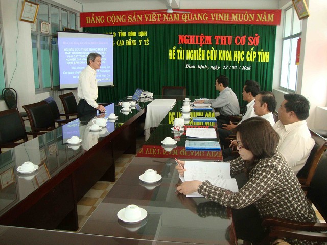 Chiều ngày 17/02/2014, Hội đồng Khoa học và Đào tạo trường Cao đẳng Y tế Bình Định đã tổ chức nghiệm thu cơ sở đề tài nghiên cứu khoa học cấp tỉnh: “Nghiên cứu thực trạng một số bất thường sinh sản ở huyện Phù Cát, tỉnh Bình Định, thử nghiệm ghi nhận bất thường sinh sản dựa vào y tế cơ sở do BSCK II Trương Quang Đạt - Trưởng Bộ môn Y tế công cộng làm chủ nhiệm đề tài.