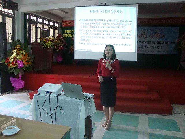 Tiếp theo chương trình đ/c Đặng Văn Lý phát biểu chúc mừng nhân ngày Phụ nữ Việt Nam và tuyên truyền, phổ biến về Luật Bảo hiểm Xã hội sửa đổi, Luật Bảo hiểm Y tế nhằm giúp cán bộ, viên chức nhà trường nâng cao nhận thức về chủ trương, đường lối, chính sách pháp luật của Đảng và Nhà nước, hiểu rõ hơn về những quy định trong chính sách Bảo hiểm. Đ/c Lê Thị Kim Chi - Trưởng ban Nữ công Liên đoàn Lao động tỉnh phổ biến về Luật Bình Đẳng giới, giúp cán bộ, viên chức nhà trường hiểu rõ, hiểu đúng, hiểu sâu sắc và toàn diện hơn về bình đẳng giới, nhằm nêu cao vị trí, vai trò của người phụ nữ trong thời đại ngày nay.