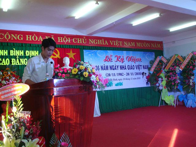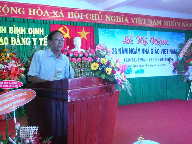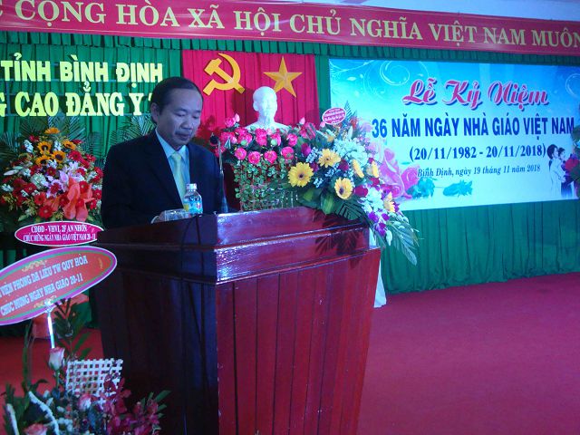 Đ/c Nguyễn Mỹ Quang - Giám đốc Sở Lao động - Thương binh Và Xã hội tỉnh Bình Định đã phát biểu chúc mừng thầy cô giáo nhân ngày nhà giáo Việt Nam, mong muốn nhà trường tiếp tục vững mái chèo trên con đường giáo dục thế hệ trẻ trở thành những cán bộ y tế có tâm, có tài, có đức cho xã hội.