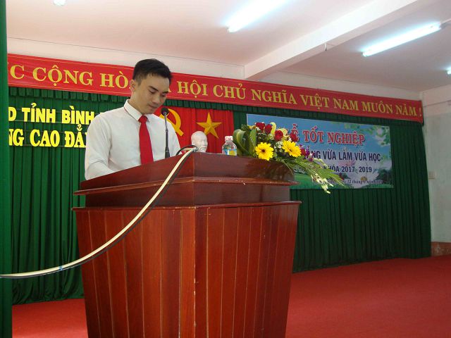 Đại diện sinh viên tốt nghiệp đã phát biểu cảm tưởng bày tỏ lòng biết ơn và tình cảm đến các nhà giáo, cán bộ, viên chức nhà trường và các cơ sở y tế đã dạy dỗ, dìu dắt. Đồng thời ghi nhận sự chia sẻ, cảm thông của những người chồng, người vợ, những người con thân yêu đã ủng hộ, động viên trong quá trình học tập để có được kết quả như ngày hôm nay. Thay mặt các bạn sinh viên xin hứa: Nguyện phấn đấu suốt đời để thực hiện tốt lời dạy của Bác Hồ “Lương y như từ mẫu”, thỏa lòng mong đợi, niềm tin của thầy, cô và lãnh đạo đơn vị. Thực hiện tốt những lời dặn của thầy, cô dù trong hoàn cảnh khó khăn nào cũng đem hết sức lực, trí tuệ và nhiệt tình của mình cống hiến, góp phần nhỏ bé xây dựng quê hương, góp phần vào sự nghiệp chăm sóc và bảo vệ sức khỏe nhân dân nói riêng và sự nghiệp công nghiệp hóa, hiện đại hóa đất nước nói chung.