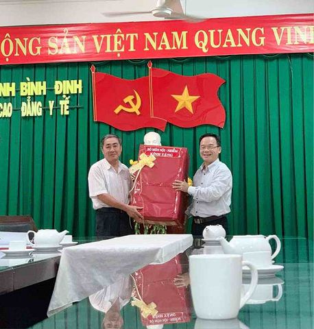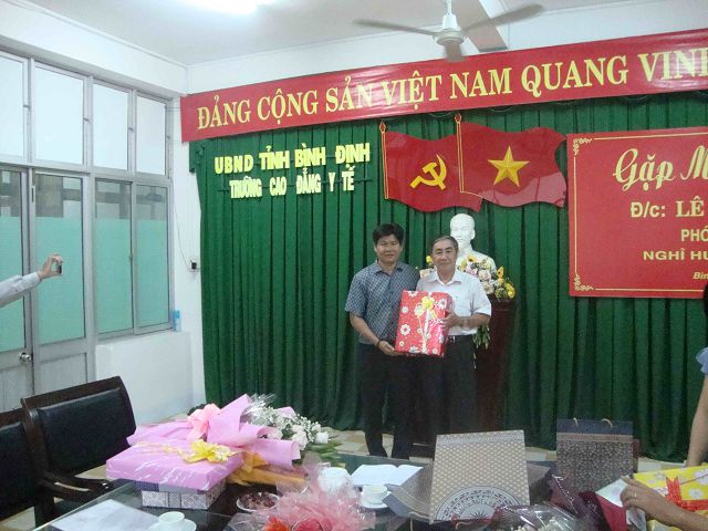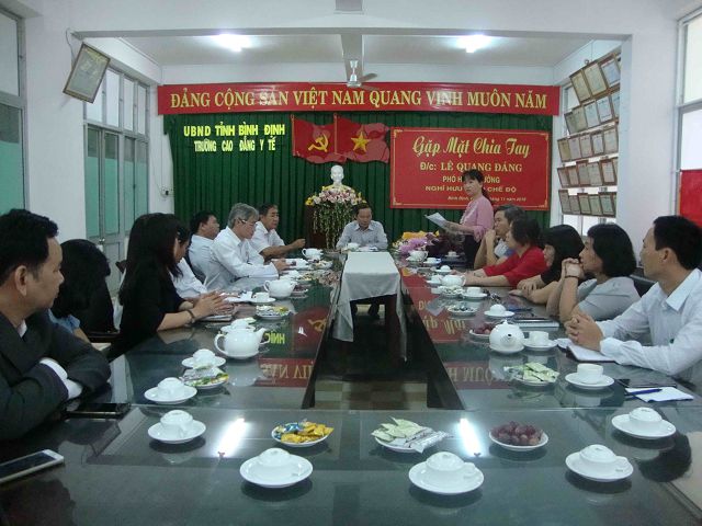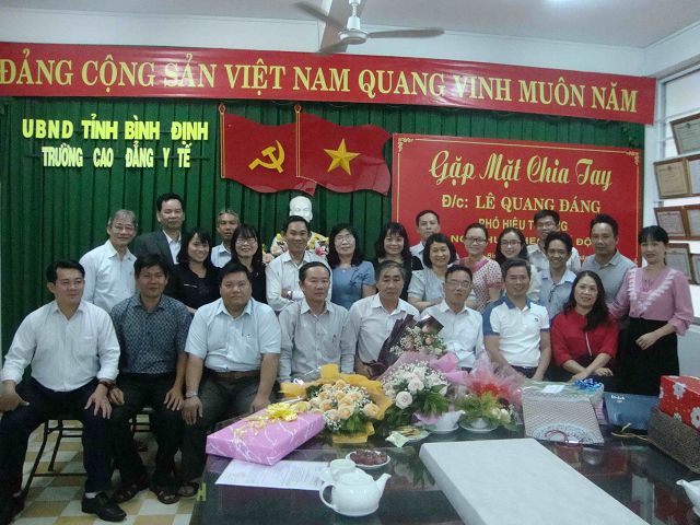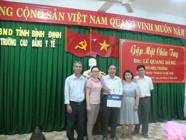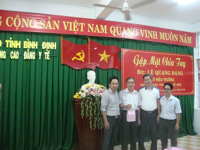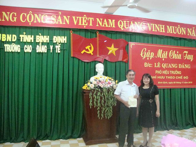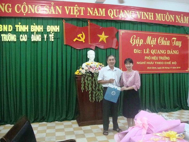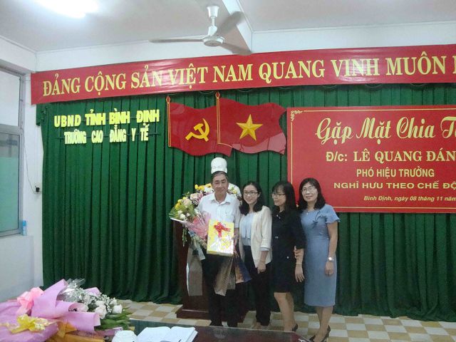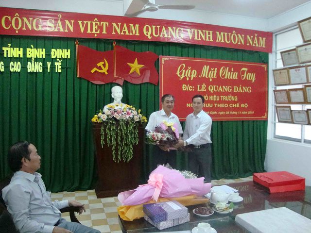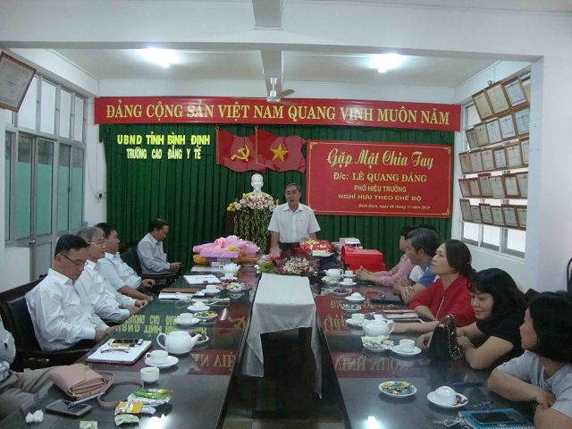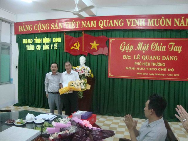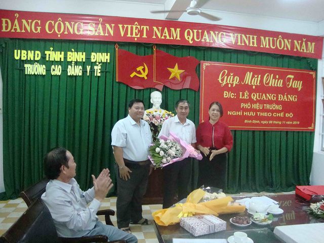 Thầy Trần Đình Đạt thay mặt cho tập thể cán bộ, viên chức và người lao động gửi tới đ/c Lê Quang Đáng nghỉ hưu lời cảm ơn và ghi nhận những công lao, những nỗ lực phấn đấu cho sự nghiệp giáo dục và đào tạo nhà trường, là 1 trong 3 người đầu tiên đã đặt nền móng cho việc thành lập trường Cao đẳng Y tế Bình Định hôm nay. Mong rằng mặc dù đ/c không còn làm việc tại trường nhưng đồng chí hãy dõi theo chúng tôi, chia sẻ với chúng tôi những kinh nghiệm quý báu để chúng tôi hoàn thành tốt nhiệm vụ của mình. Chúng tôi xin hứa với đồng chí sẽ duy trì, giữ vững và phát huy những thành quả đã đạt được, quyết tâm xây dựng nhà trường ngày càng phát triển. Đồng thời đ/c Trần Đình Đạt cũng trao quyết định nghỉ hưu và tặng hoa. Ban Giám hiệu, Công đoàn, Đoàn thanh niên nhà trường và các phòng/bộ môn cũng tặng hoa và quà kỷ niệm. Những kỷ niệm vui buồn trong thời gian công tác được ôn lại trong không khí đầm ấm.