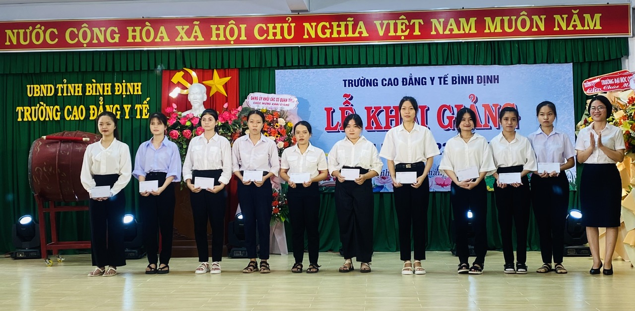 Cũng trong Lễ Khai giảng, Nhà trường rất hân hạnh nhận được sự quan tâm đồng hành và hỗ trợ của các đơn vị - Nhà tài trợ. Nhiều suất học bổng được trao đến tay HSSV thuộc các đối tượng có hoàn cảnh đặc biệt khó khăn, sinh viên có nỗ lực vượt khó đạt thành tích tốt trong học tập. Trong đó, Hội khuyến học Tỉnh Bình Định trao 10 suất học bổng trị giá 1.000.000đồng/suất; Ngân hàng Agribank Bình Định trao 20 suất trị giá 500.000 đồng/suất; Ngân hàng BIDV chi nhánh Quy Nhơn trao 10 suất học bổng trị giá 500.000 đồng/suất; Green Field Bình Định – Viện Chăm sóc Mẹ và Bé GFS Bình Định trao 10 suất học bổng trị giá 500.000 đồng/suất; Công ty TNHH Chăm sóc sức khỏe Bùi Dung trao 10 suất học bổng trị giá 500.000 đồng/suất. Đây là những món quà vô cùng ý nghĩa, không chỉ giúp đỡ sinh viên học sinh giảm bớt phần nào khó khăn về tài chính, mà còn có giá trị cổ vũ nâng cao tinh thần, giúp các em cố gắng hơn trong học tập, rèn luyện và phấn đấu để trở thành những sinh viên tốt trong Nhà trường.